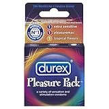 The DUREX Pleasure Pack proves that nothing is more exciting than lots of choices. This pack contains three of the most stimulating DUREX condoms: Extra Sensitive, Pleasuremax, and Tropical Flavor. Whether you want to try something new, are in a playful mood, or want to enhance mutual pleasure, this pack has something for you. Whichever latex condom you choose, you'll enjoy a high level of protection from pregnancy and STDs as well as a little something extra to intensify the experience.Pleasure PackVariety of sensation and stimulation condomsPleasure Pack CondomsAt a Glance:Contains three typ